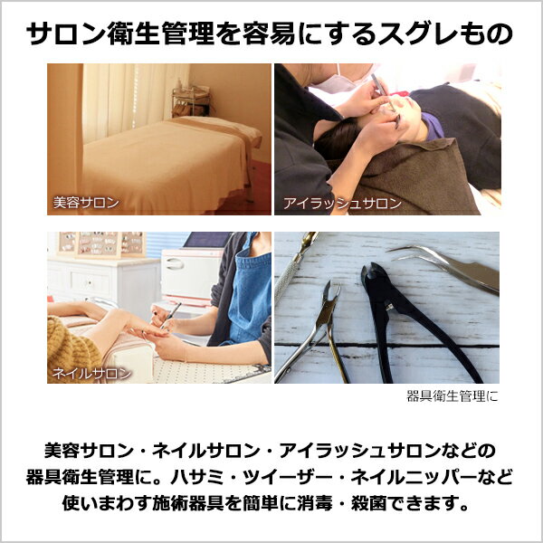 ハサミ・ツイーザー・ネイルニッパーなど複数の器具を一度に消毒・殺菌できるため、サロン衛生管理を容易にするスグレものです。